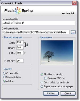 Cuenta con algunas opciones de configuración que te permiten, por ejemplo, delimitar el tamaño de la presentación, seleccionar el tiempo de permanencia de cada imagen en pantalla, elegir exactamente las diapositivas que quieres incluir en la animación Flash, etc.